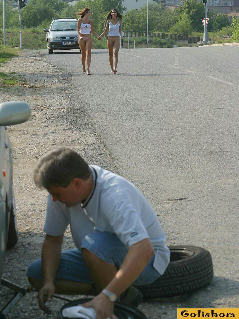 Голые девушки путешествуют по загородным дорогам