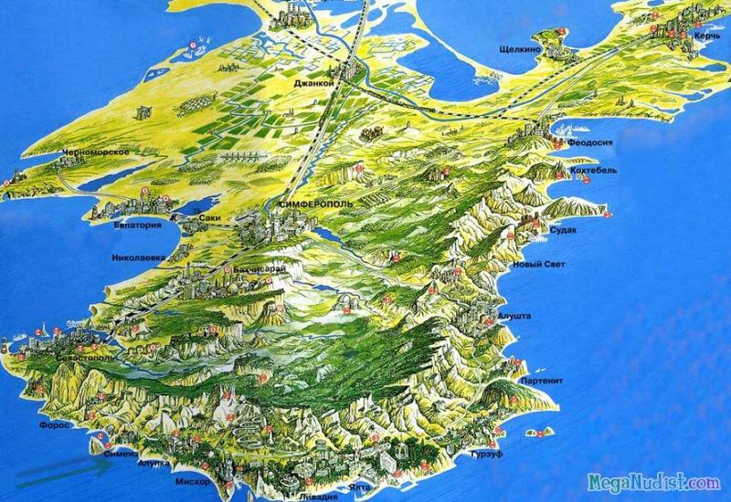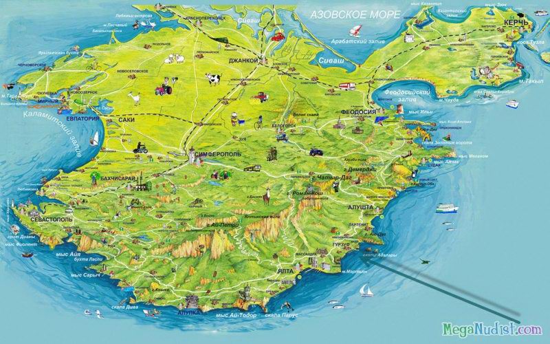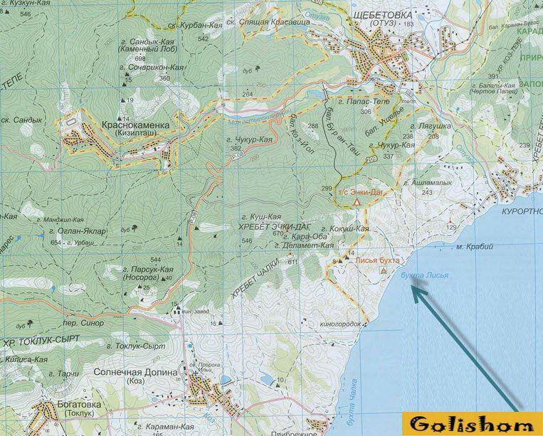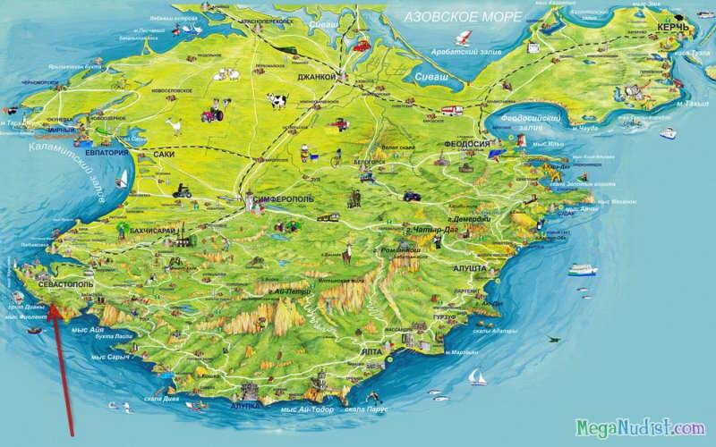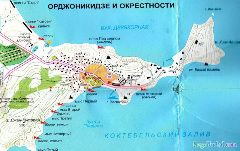 Мало кто знает, что данный дикий пляж является гарнизоном Черноморского флота РФ. Нудистов манят сюда район Киик-Атлама и роскошная бухта Бугас. Красивые ландшафтные памятники в виде горного хребта Эчки-даг и мыса Меганом буквально завораживают с первого взгляда. Получается, что на этом каменистом пляже можно всецело соединиться с природой: и душой, и телом. А ведь ради новых эмоций и впечатлений мало кто отказывается от утомительной поездки по грунтовым дорогам.