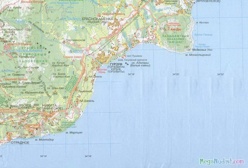Гурзуф – это территория сплошных санаториев и пионерских лагерей. И как раз между ними расположились нудистские пляжи. Скромно устроившись на "носу" Медведь-горы, они - малодоступные и необжитые - радуют свое чистотой и красотой. Более опытные нудисты отмечают, что в шторм лучше держаться от них подальше. Но в спокойную солнечную погоду нет ничего приятнее, чем понежить голое тело на теплых огромных круглых валунах. Полное отсутствие удобств и инфраструктуры позволяет назвать данные места по-настоящему дикими. А что еще нужно современному нудисту?!