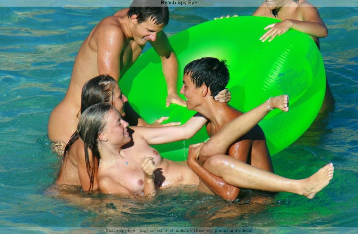 Молодёж, нудистская поросль, развлекается голышом на пляже.