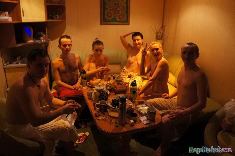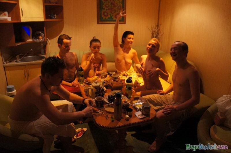 Большая группа нудистов посетила баню
